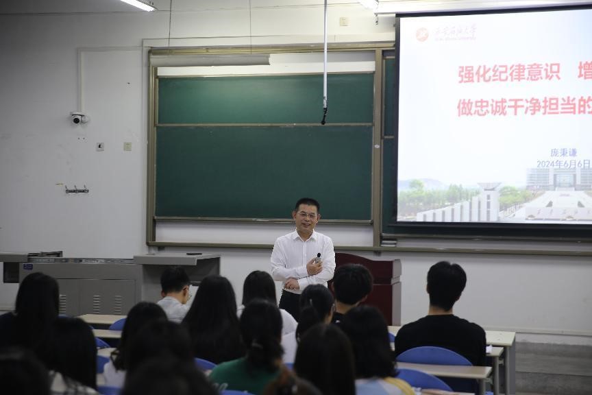 为扎实推动党纪学习教育走深走实,根据学校党委关于在全校开展党纪学习教育的要求和学院党委工作安排,6月6日晚,sunbet申慱官网党委书记庞秉谦结合学习体悟和工作实际,在鄠邑校区博思楼B110教室讲授了题为“强化纪律意识,增强纪律定力,做忠诚干净担当的大学生党员”纪律党课。学院2021级本科生党员80余人参加了党课学习。