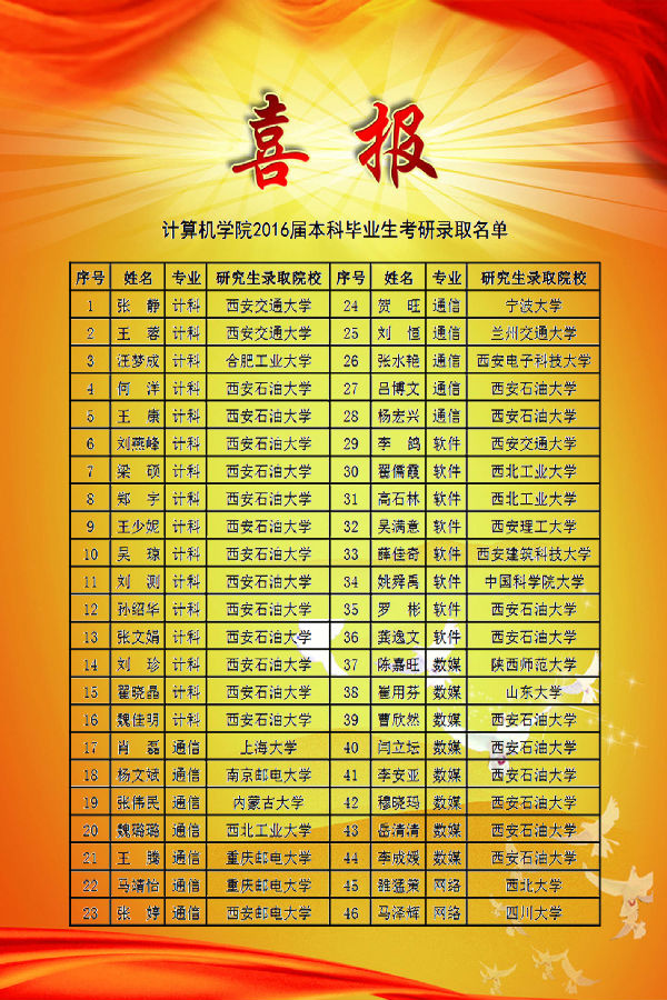 近日,全国高校硕士研究生录取工作陆续结束。sunbet申慱官网371名应届本科毕业生中,56人考研上线,占全体毕业生的15%,46人最终分别被中国科学院大学、西安交通大学、西北工业大学、西安电子科技大学、陕西师范大学等知名高校录取,录取率达到12.4%,创学院应届毕业生考研佳绩。