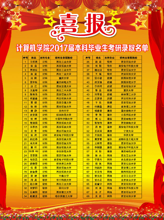 近日,2017年全国硕士研究生招生工作落下帷幕,申慱官网2017届本科毕业生考研工作传来捷报。共有80名同学考研上线,占毕业生总数22.5%,68名同学考研成功,考研录取率为19.1%,创申慱官网考研录取新高。