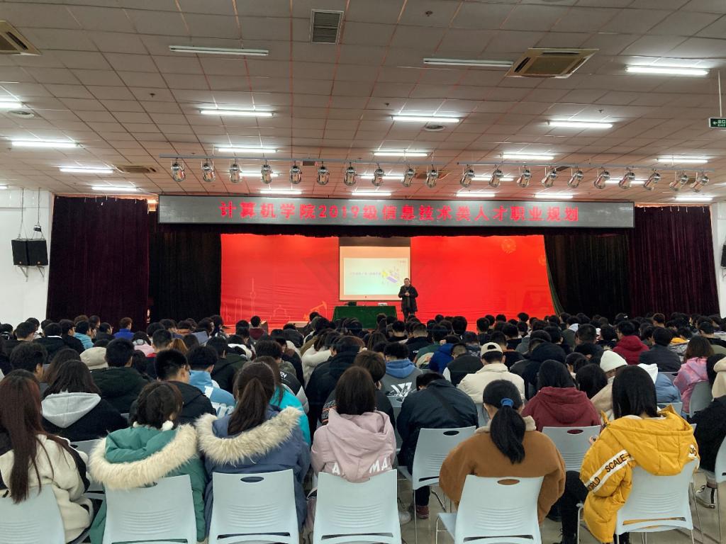 12月9日晚,sunbet申慱官网在鄠邑校区腾辉活动中心举办“信息技术类人才职业规划”报告会。前阿里P9,10年互联网行业从业经验,阿里最年轻的资深专家之一焦英俊老师受邀为大家作报告,辅导员王天航及全体2019级学生参加报告会。