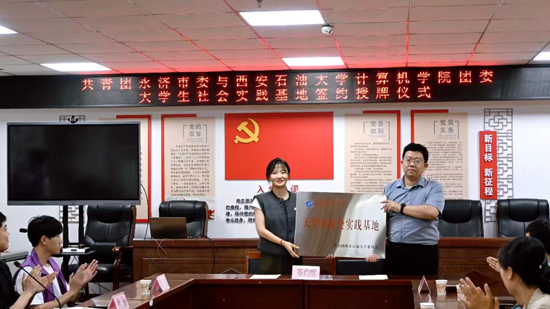 7月8日下午,学院团委与共青团永济市委在永济市会议中心樱花社区会议室举行了校地合作签约授牌仪式。sunbet申慱官网方面,学院团委书记乔晓、2022级团总支书记姚谦及10名社会实践同学参加了本次活动。永济市团委书记史晓媛,副书记高卓、樊政君,挂职副书记张国伟出席了仪式。