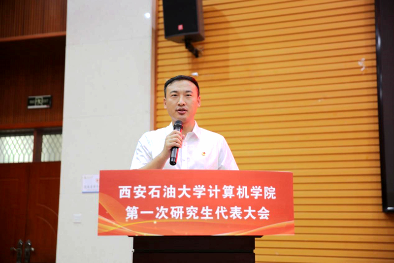 校研究生会执行主席张振陆致辞,他首先对学院研究生工作给予了高度肯定,并表示学院可以在和校研究生会的交流中,聚焦学术创新、权益维护和计算机学科特色方面,打造有温度、有活力的研究生组织。