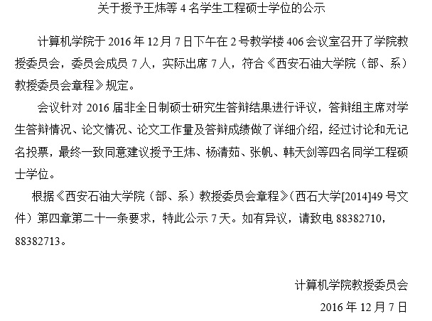 关于授予王炜等4名学生工程硕士学位的公示