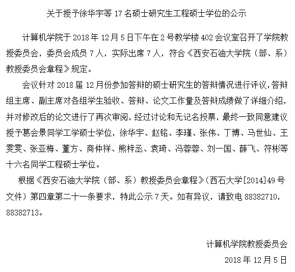 关于授予徐华宇等17名硕士研究生工程硕士学位的公示