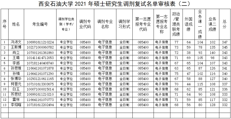2021年硕士研究生复试名单(专业学位全日制2)公示