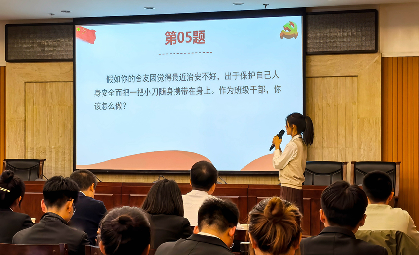本次活动主要分为班级干部素质能力大赛决赛和班级建设大赛汇报展示两大部分。首先进行的是班级干部素质能力大赛决赛,包含“班情熟知”和“案例分析”两个环节,分别考察班级干部对班级每位成员基本情况的了解程度和班级干部在面对班级日常管理、稳定安全、疫情防控、班风学风、同学关系等问题时的思路、原则、方法和启示。